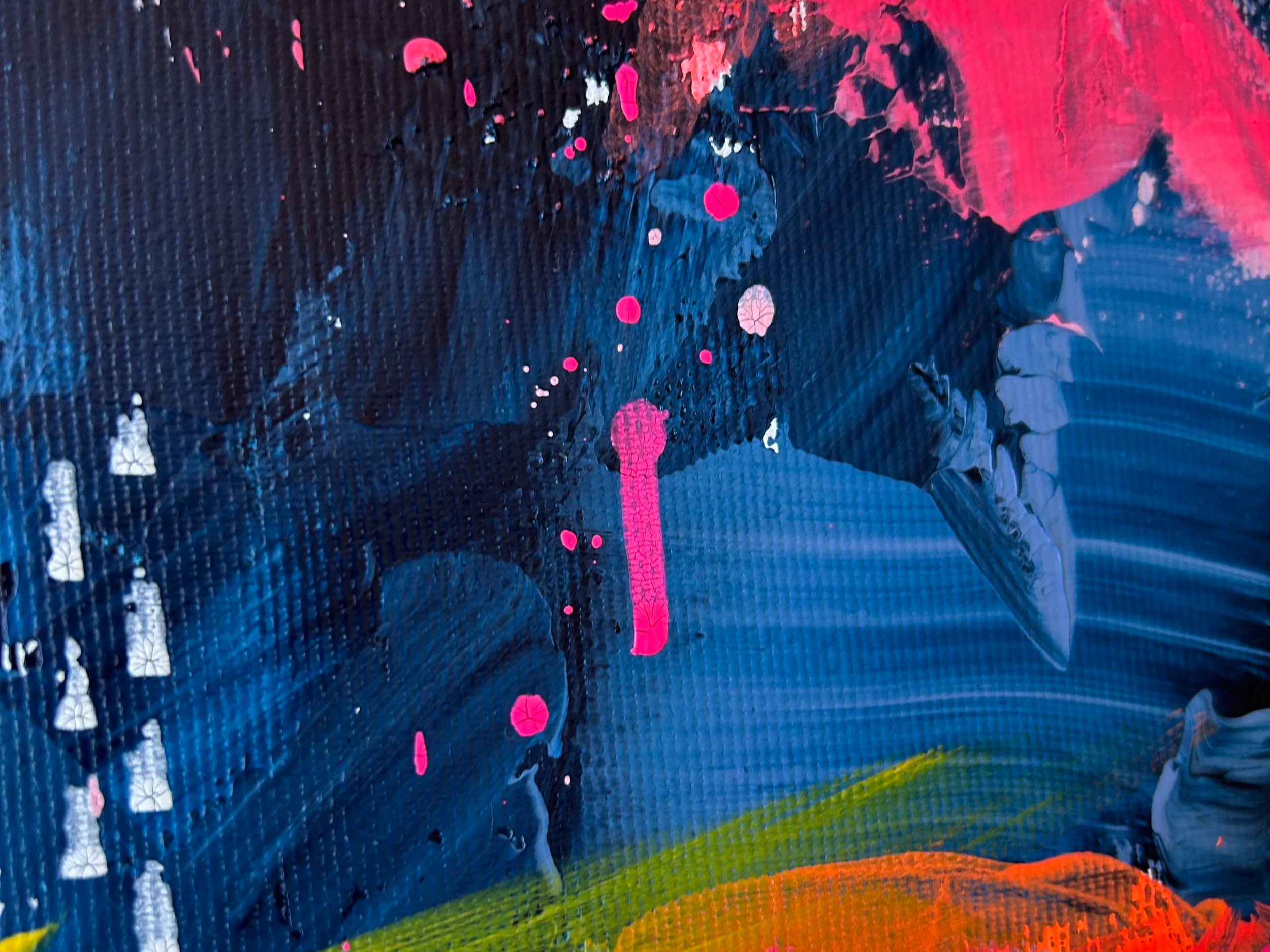 Neon Eruption entstand intuitiv und sehr körperlich. Die Farbe wurde in Schichten aufgebaut, wieder aufgebrochen, verschoben und teilweise fast skulptural aufgetragen. Dabei wechselten sich kontrollierte Entscheidungen mit spontanen Gesten ab.